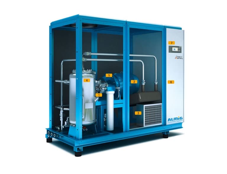 Os compressores de parafuso da série LENTO, livre de óleo, proporcionam a máxima relação custo-benefício no tratamento de ar comprimido, correspondendo com precisão o fluxo de volume às necessidades exatas de ar comprimido e através de baixas temperaturas de saída de ar comprimido e custos de serviço e manutenção minimizados. Não apenas existe demanda por ar comprimido 100% livre de óleo de alta qualidade nas indústrias farmacêutica, alimentícia, de engenharia elétrica e médica, mas onde quer que sejam produzidos produtos da mais alta qualidade. Portanto, os compressores isentos de óleo da série LENTO da ALMiG fornecem a qualidade máxima do ar comprimido em áreas de uso altamente sensíveis. Somente a água, a mais natural de todas as matérias-primas, é usada no processo de compressão. Isso produz: Ar comprimido limpo e ambientalmente correto sem óleo; partículas de poeira extraídas são lavadas pela água O condensado limpo – água pura – pode ser descarregado diretamente no sistema de esgoto Temperaturas muito baixas durante a compressão, graças à excelente transferência de calor através da água. Portanto, apenas pequenas quantidades de energia são usadas para gerar o ar comprimido.